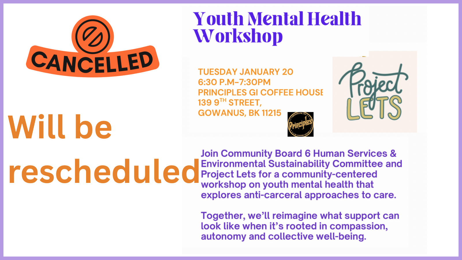 The Youth Mental Health Workshop scheduled for tonight, Tuesday, January 20, at Principles GI Coffee House has been cancelled.